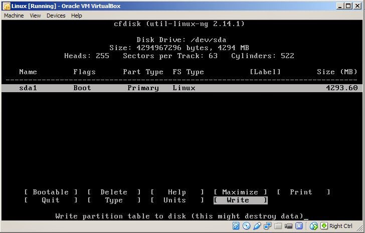 - Setelah membuat partisi selesai dan proses selesai. Jangan lupa untuk membuat Bootable agar partisi dapat dijalankan dalam mode bootable. Selanjutnya pilih Write kemudian enter. Apabila muncul konfirmasi, ketikkan yes dan enter.